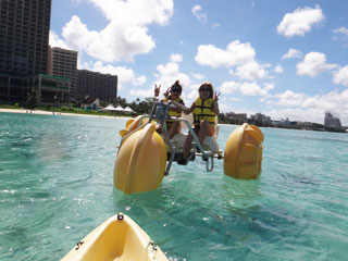 グアムのアウトドアでのアクティビティはマリンスポーツです。アウトリガー前にアクティビティセンターがあり、ここで大体道具一式が揃います。カヌー、白鳥のボート、シュノーケリング、バナナボートなど。